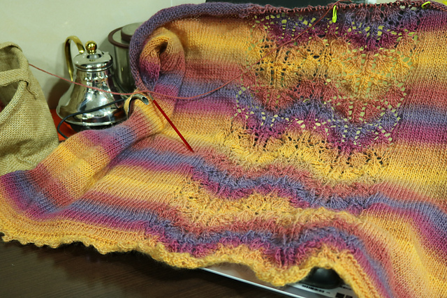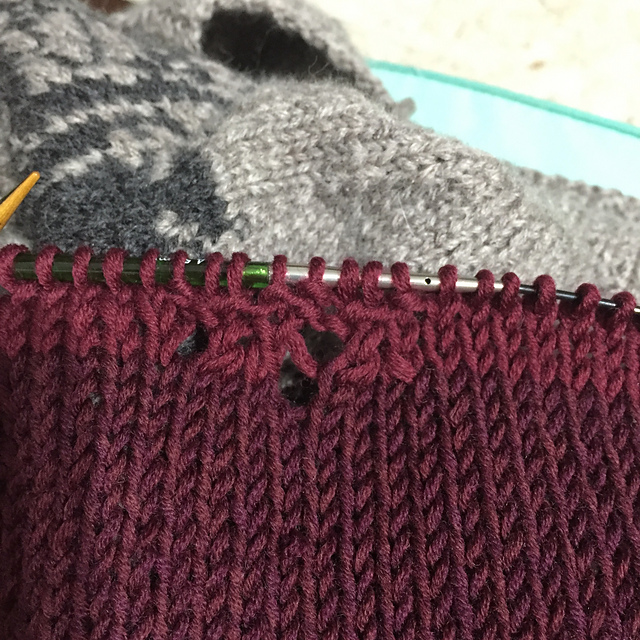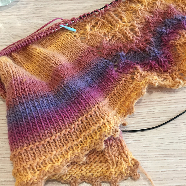 腰部減針完,換色開始加針,加針完織平針到需要的長度後換色,開始進入蕾絲花樣。