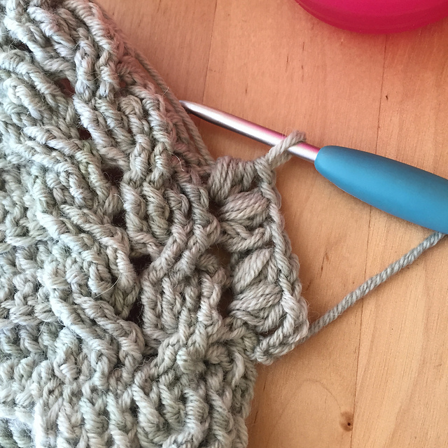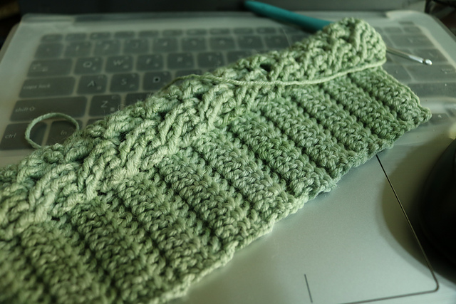 先橫向編織完rib和麻花之後,銜接起來再鉤帽體。