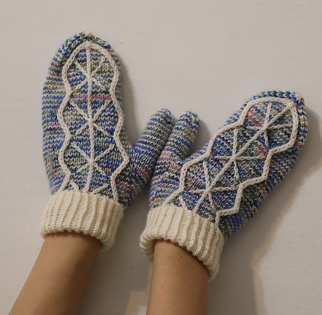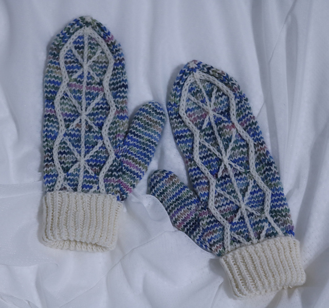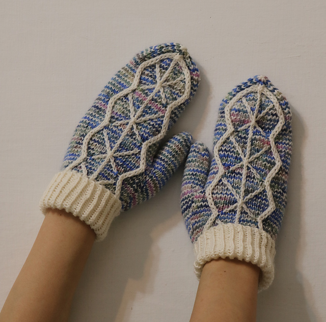 I used fingering weight sock yarn instead of sport weight used in Claire's sample, since I knit loosely I have to use thinner yarn to get gauge. My row gauge is 1 st off so the mittens are slightly longer but still fit my hand well.
